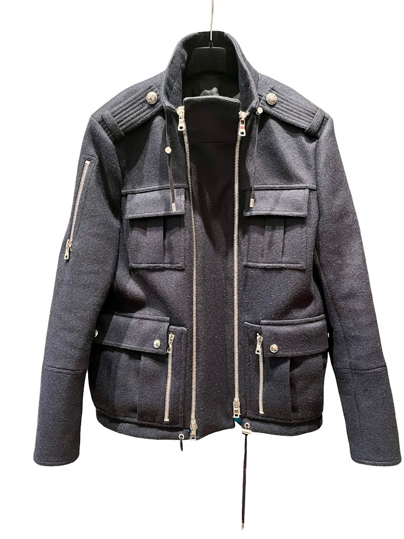 Die Jacke ist mit silberner Hardware verziert und verfügt über auffällige Zippverschlüsse an der Vorderseite. Praktische seitliche Taschen unterstreichen die Alltagstauglichkeit, während das Innenfutter aus schwarzer Baumwolle für hohen Tragekomfort sorgt.